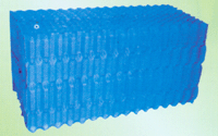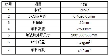 双向波填料为薄膜式,其片形由正弦波和梯形波分段错位的直波组成.提高了气水的扰流和下汇速度减缓,提高了填料的散热特性,由于增大了通孔面积,保证了胶球畅通,提高了防泥垢堵塞的能力,其热力特性和阻力特性与引进的复合波填料相当,具有良好的冷却效果。 填料单元组件规格